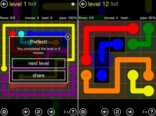 Game bernama Flow Free terbilang susah-susah gampang, dimana kita harus menghubungkan dua titik dengan warna yang sama berupa garis lurus seperti membuat sebuah jalur. Terdapat beberapa pasang titik dengan warna berbeda yang harus diselesaikan oleh para pemain.