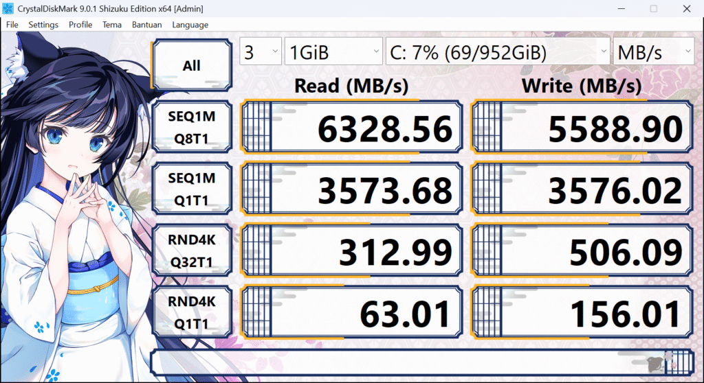 Penyimpanan juga lega, karena ASUS kasih SSD PCIe 4.0 1TB dengan kecepatan baca bisa tembus 6GB/s. Sistem responsif, boot cepat, dan ruang penyimpanan luas. Kekurangannya, nggak ada slot M.2 tambahan, jadi kalau mau upgrade, harus ganti SSD-nya langsung.