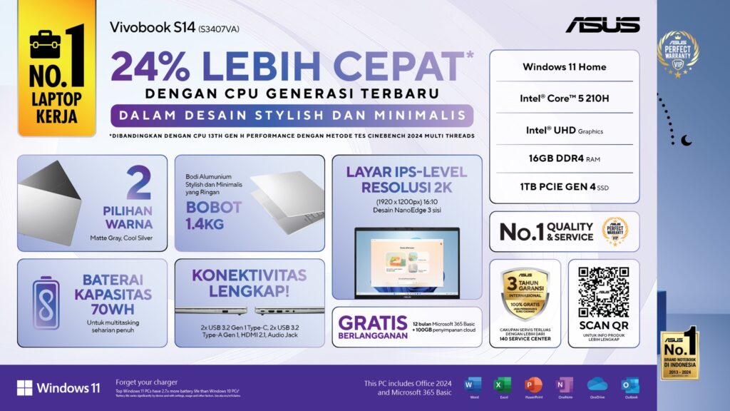 ASUS juga ngasih paket lengkap buat pengguna umum: Windows 11 Home, Microsoft Office Home 2024 + Microsoft 365 Basic, dan bonus Xbox Game Pass PC 3 bulan. Ditambah lagi garansi global 3 tahun, yang layanan ASUS di Indonesia juga tergolong oke.